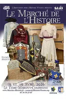 Les 18 et 19 avril 2026 se déroulera au Tigre, la 8ème édition du Marché de l’Histoire de Compiègne, qui prend le relais du Marché de l’Histoire de Pontoise qui existait depuis 2005.Il rassemblera plus de 240 exposants de 14 nationalités. Les périodes couvertes seront les suivantes: Préhistoire, Antiquité Celte et Romaine, Moyen Age, Renaissance, Empire, Belle Époque, XXème siècle…