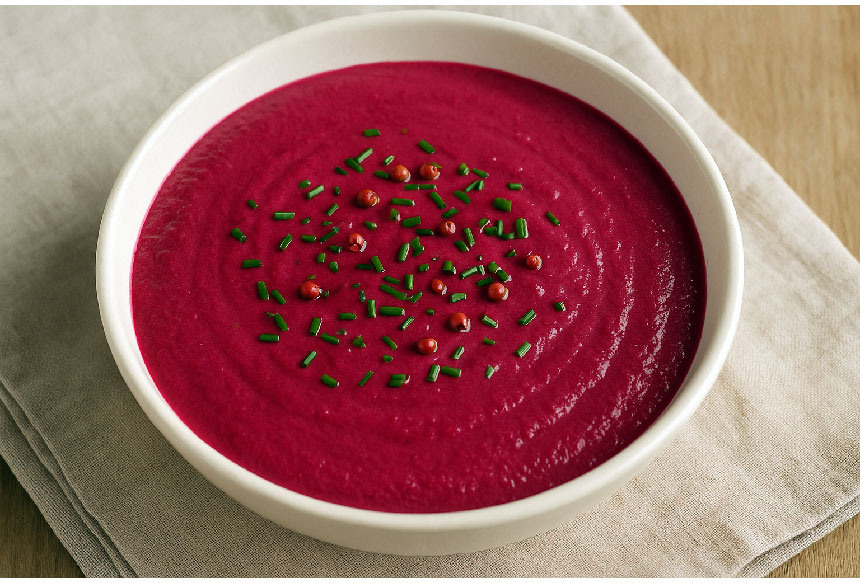Coupez les betteraves en morceaux et mixez-les avec le bouillon de légumes préalablement préparé (cube de bouillon tout prêt).