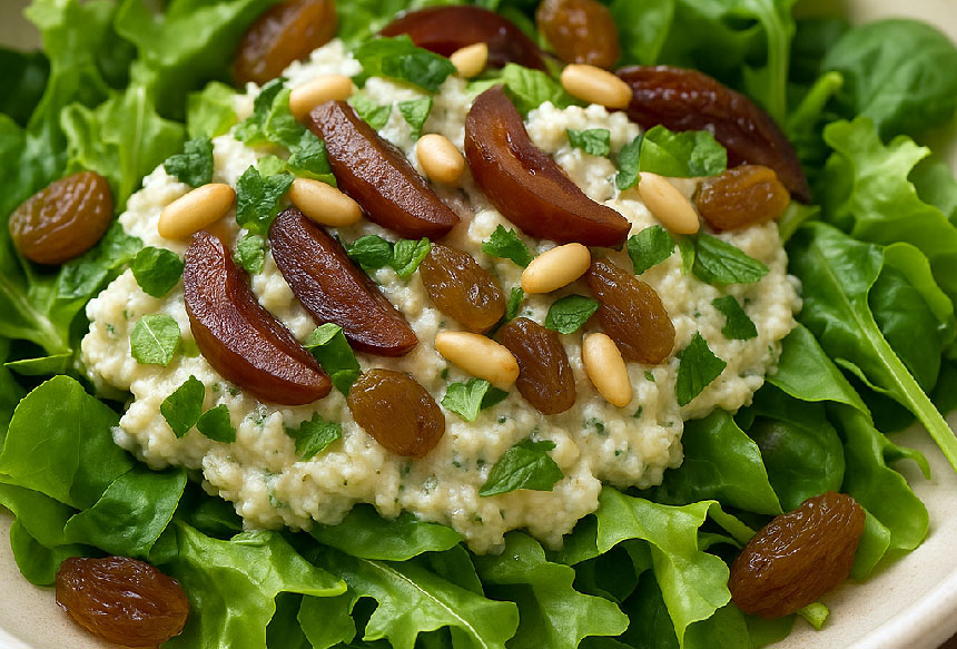 - Dans une assiette, disposez la salade, saupoudrez de pignons, de raisins et de lamelles de dattes.